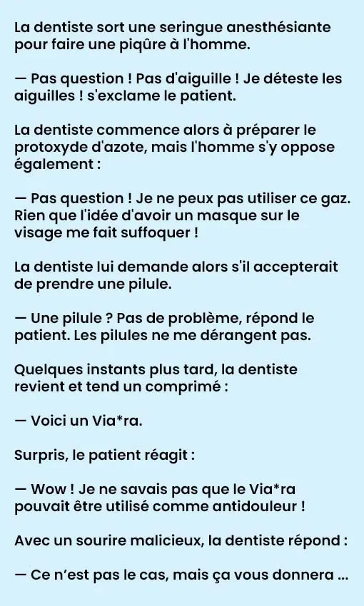 Le dentiste change alors son approche et propose un calmant sous forme de comprimé, agrémenté d’une pointe d’humour :