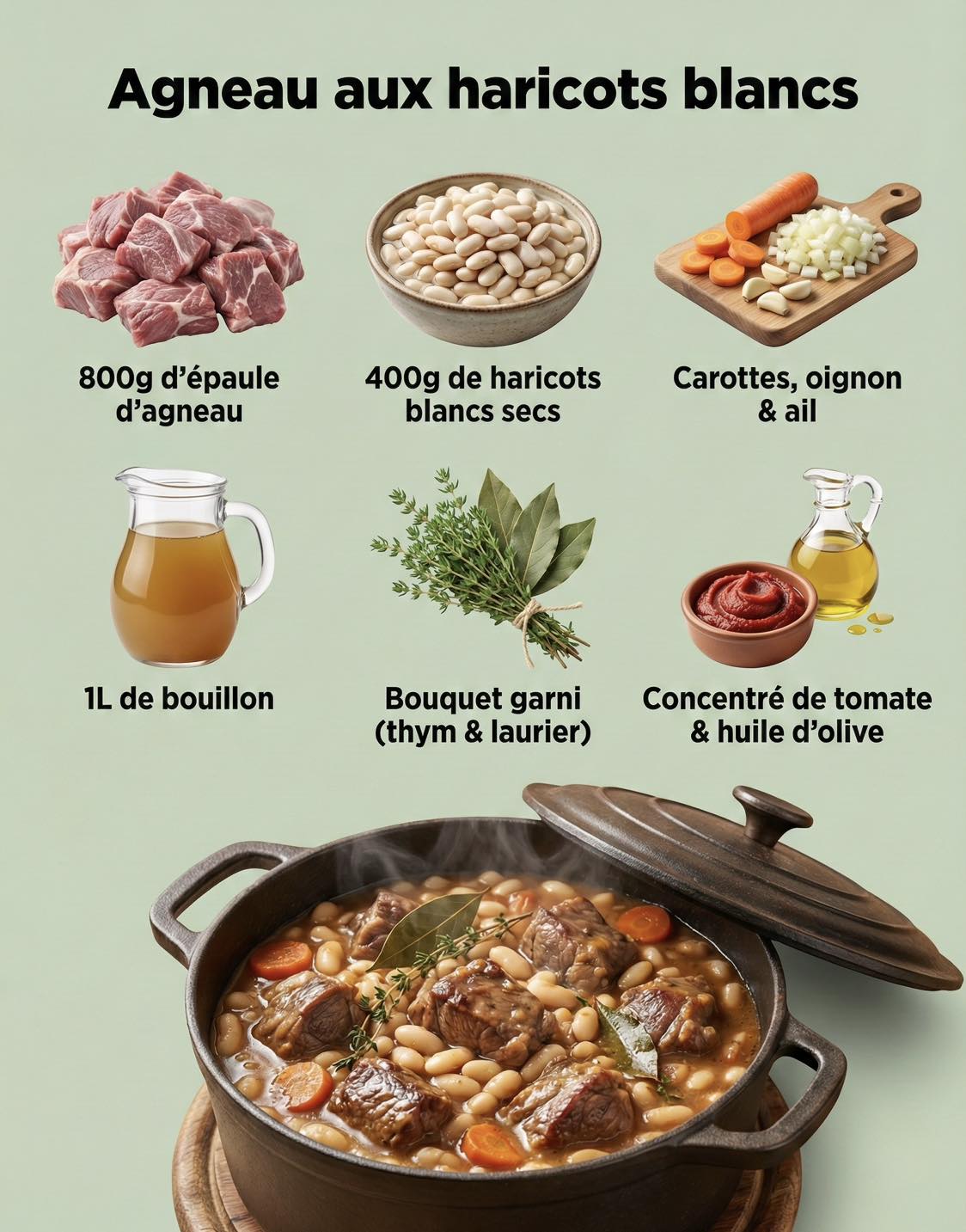 Ce ragoût traditionnel est une célébration de la patience et des saveurs authentiques. L’épaule d’agneau, choisie pour son moelleux, mijote longuement avec des haricots blancs secs qui absorbent le bouillon infusé au thym et au laurier. Le concentré de tomate et les petits légumes apportent une profondeur de goût et une couleur ambrée irrésistible, faisant de ce plat un classique indémodable des repas conviviaux.