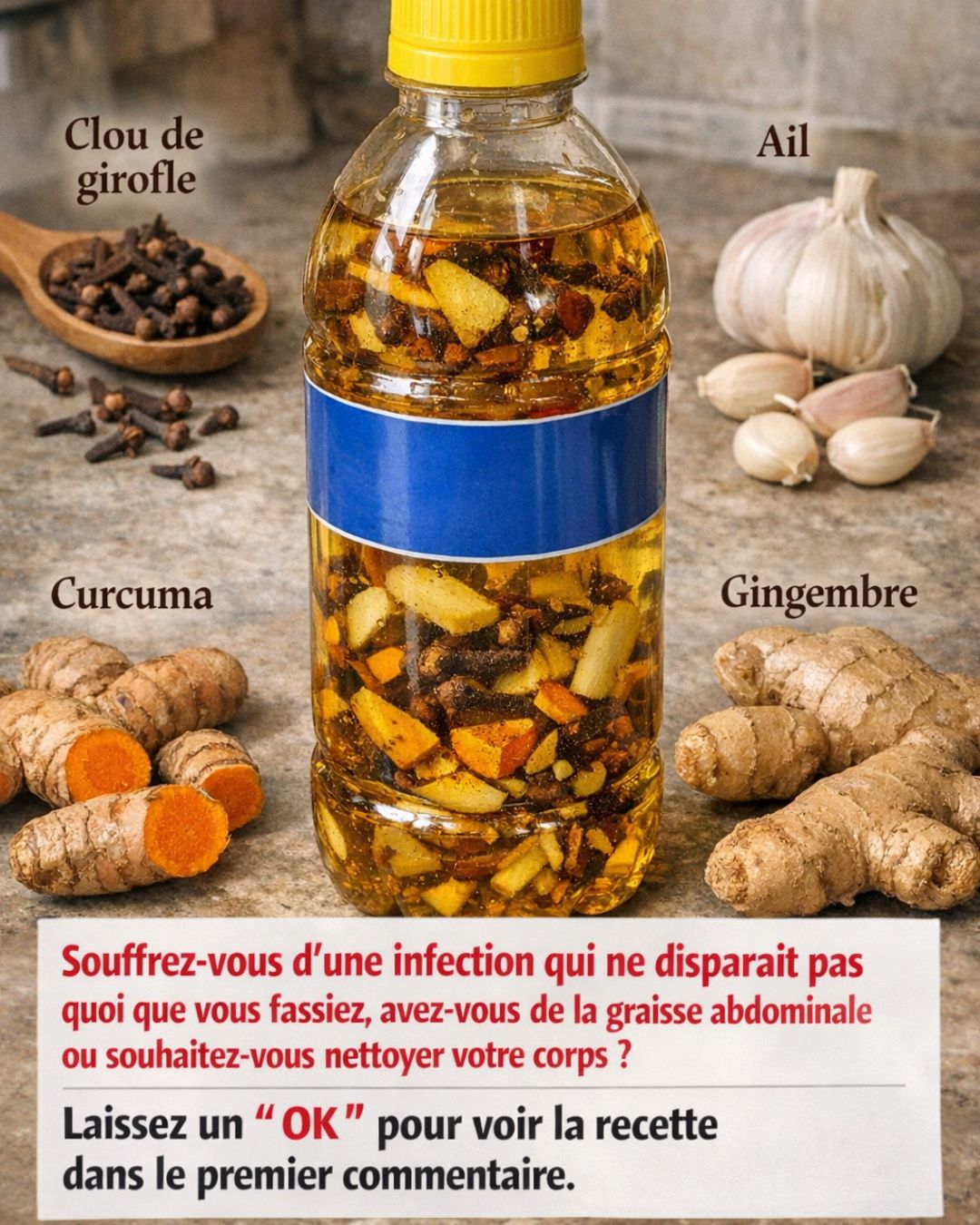 Aujourd’hui, je vous partage une préparation naturelle simple à base de quatre ingrédients puissants : clou de girofle, ail, curcuma et gingembre. Ce mélange traditionnel est utilisé depuis des siècles pour soutenir le système immunitaire, favoriser la digestion et contribuer à réduire l’inflammation.