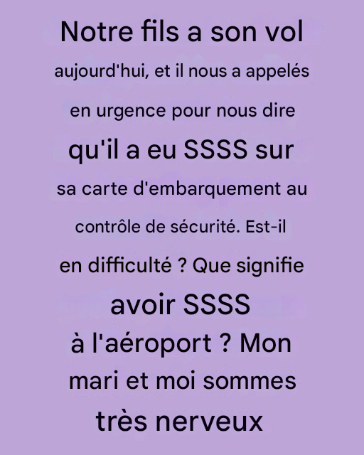 au contrôle de sécurité. Mais si vous voyez « SSSS » sur votre carte d’embarquement, préparez-vous à un contrôle supplémentaire. Ces quatre lettres