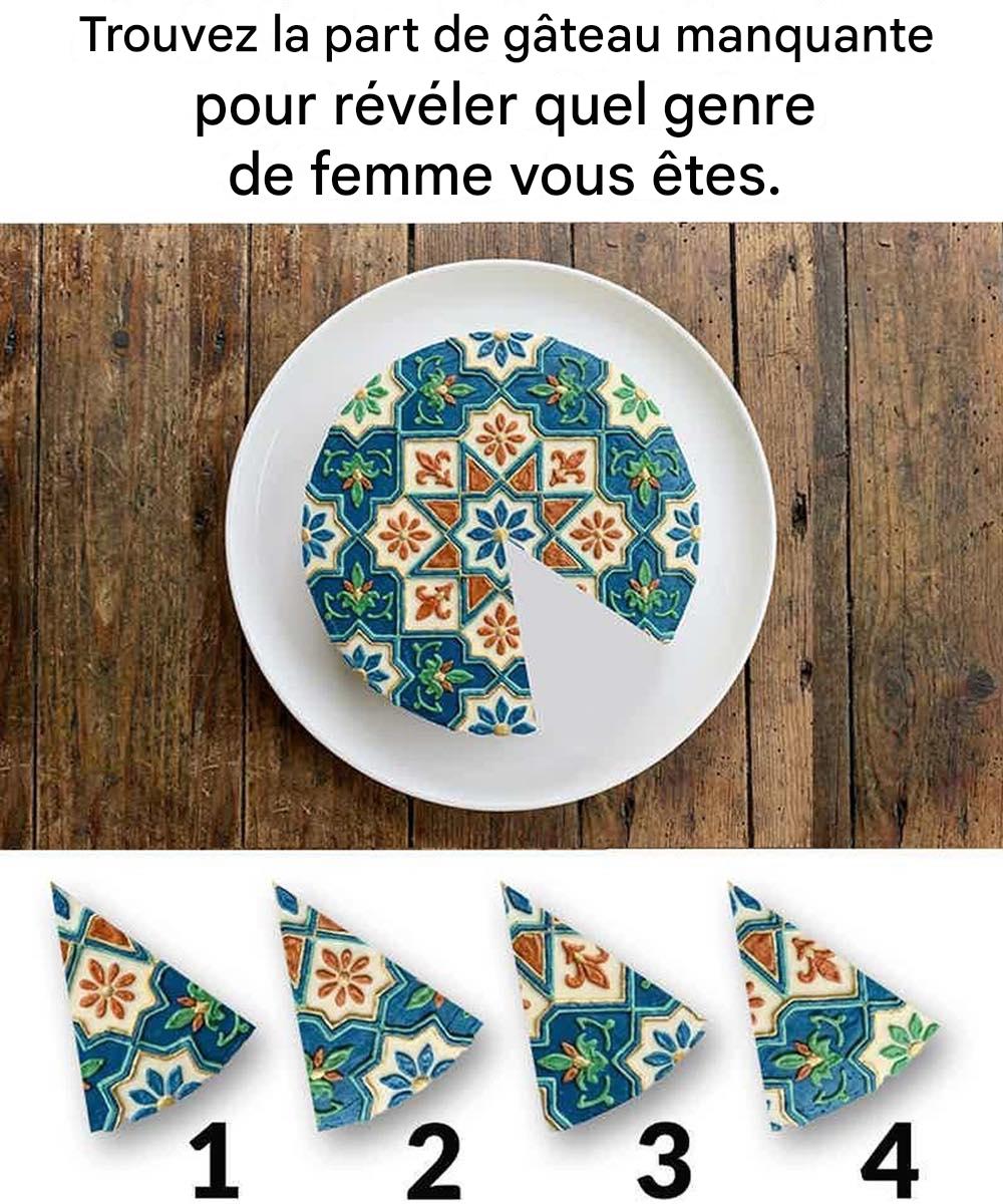 À première vue, cela peut ressembler à un simple puzzle visuel, mais c’est aussi un test de personnalité amusant. La pièce qui, selon vous, complète le mieux le gâteau peut refléter certains traits de votre caractère, votre façon de prendre des décisions et votre vision de la vie.