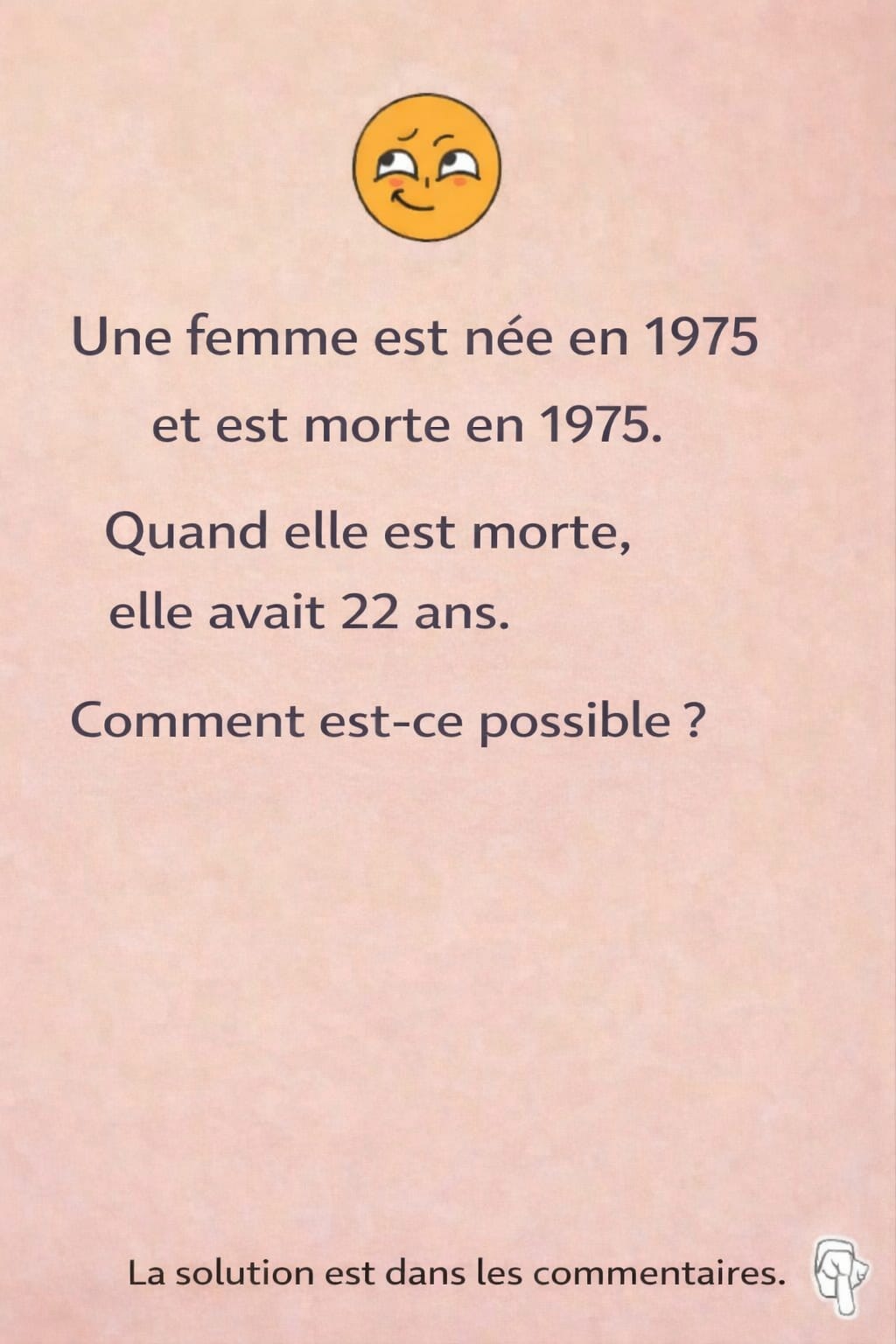 Imaginez: en parcourant les nouvelles, vous rencontrez cette formulation étrange. “La femme est née en 1975 et est morte en 1975. Elle avait 22 ans”” soudain, Il vous bloque. Pas clair? Troublant? Il doit y avoir un piège quelque part… mais où? Accrochez-vous, car ce puzzle teste notre logique, nos réflexes et nécessite une pincée d’imagination. Et si la clé ne devait pas penser de la manière habituelle?