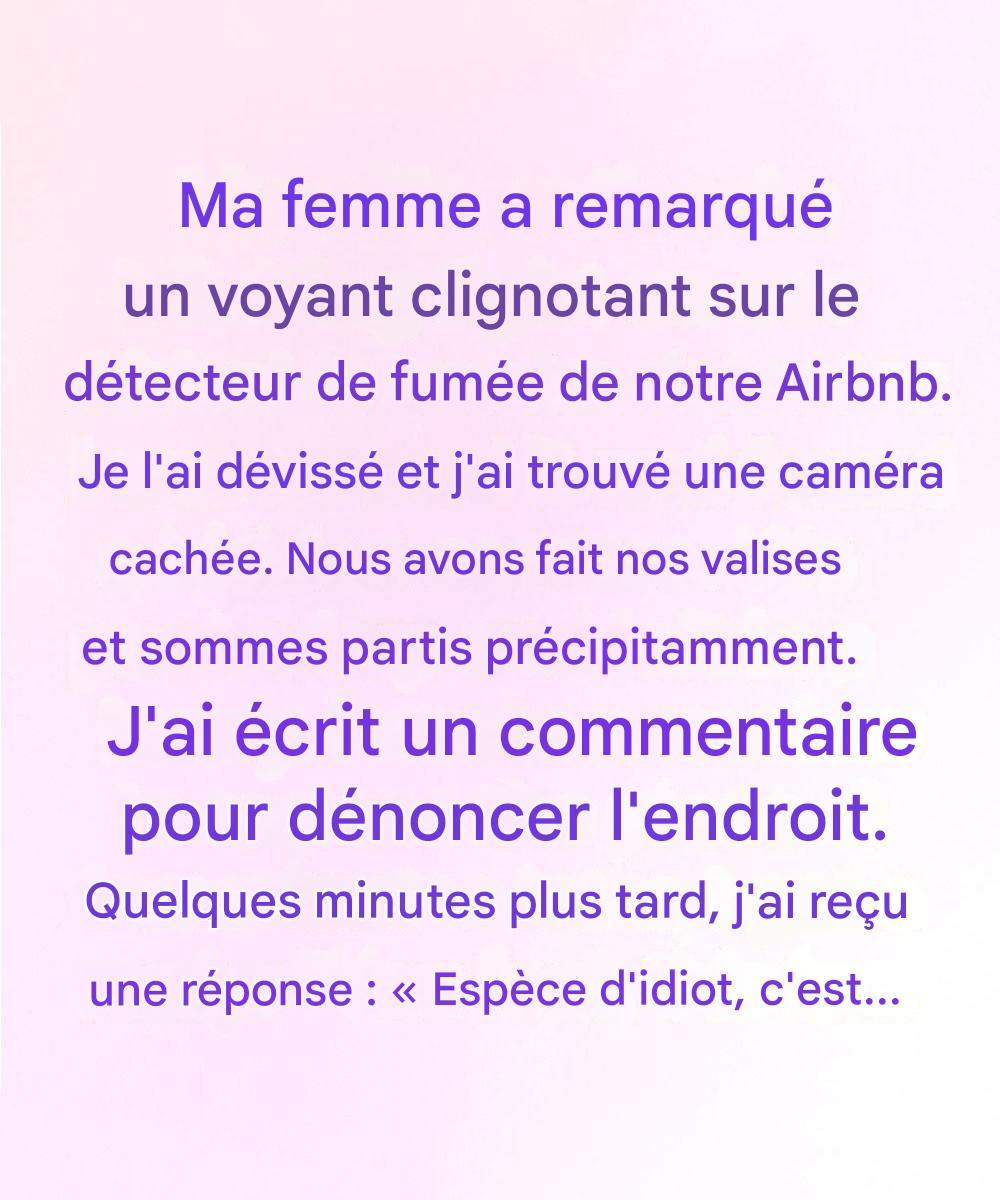 Nous nous sommes arrêtés dans un restaurant à deux villes de là, garés sous la lumière crue des néons, et avons tenté de reprendre notre souffle. J’ai ouvert mon ordinateur portable et rédigé une critique furieuse, mettant en garde les futurs voyageurs contre la caméra cachée que nous avions découverte.